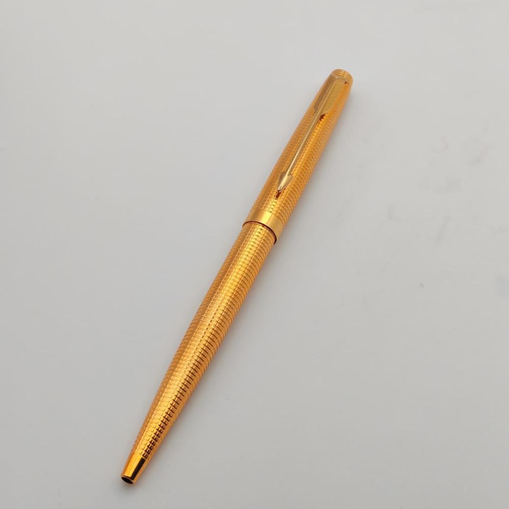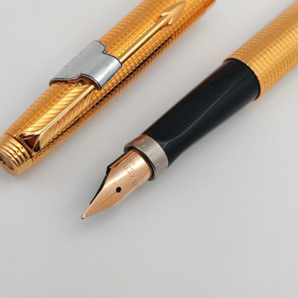قطعة فنية من تاريخ Parker، الطقم مكوّن من قلمين (حبر ريشة + جاف) بتشطيب ذهبي فاخر ونقشة "Grain d’Orge" الدقيقة التي تُعد من أجمل نقوش Parker الكلاسيكية.