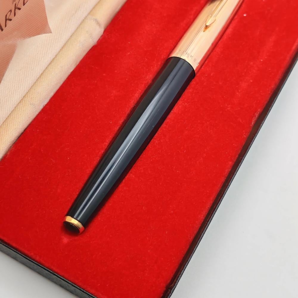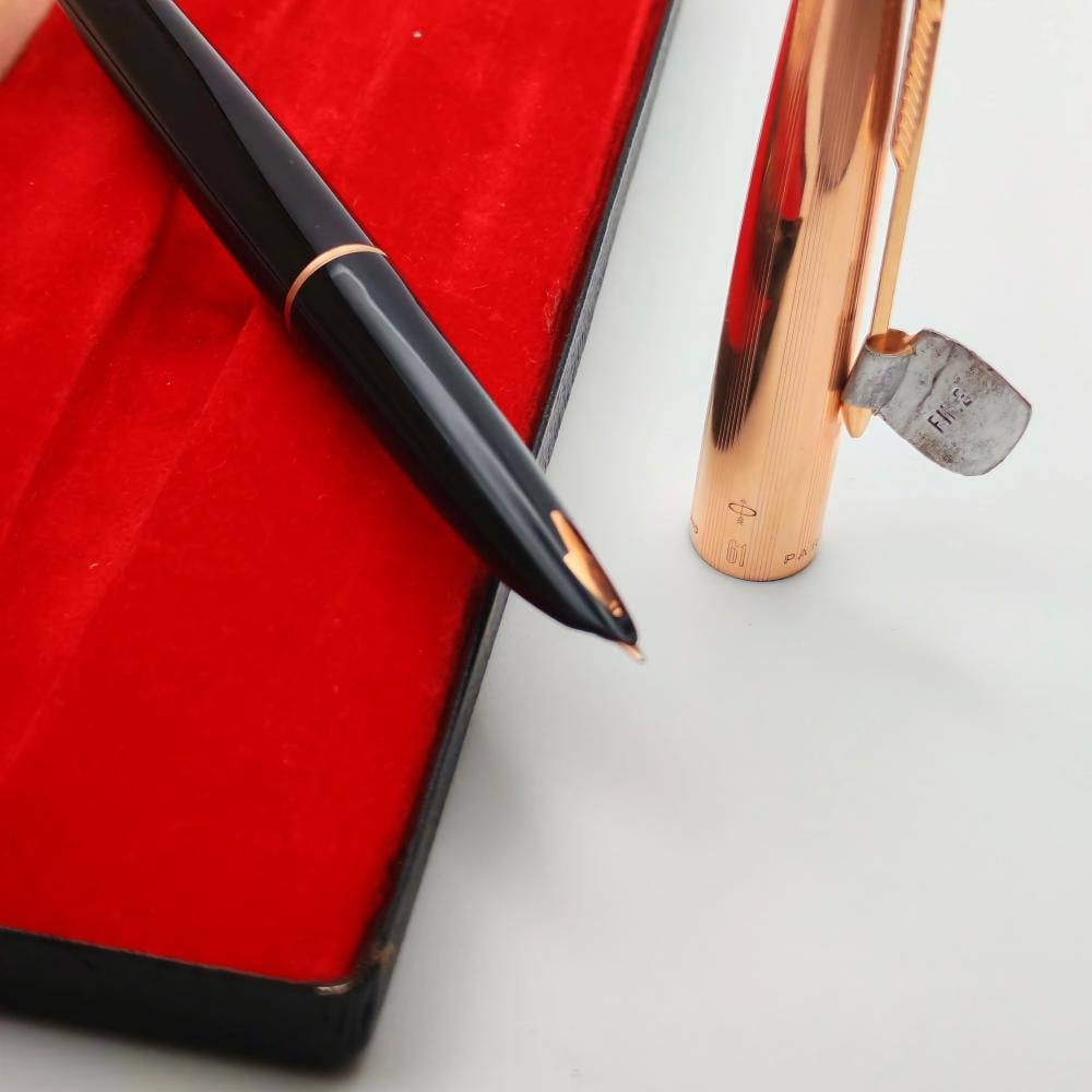قلم فاخر من إصدارات Parker 61 الكلاسيكية، باللون الأسود الأنيق مع غطاء مطلي بالذهب مختوم بجميع العلامات الأصلية لشركة Parker.