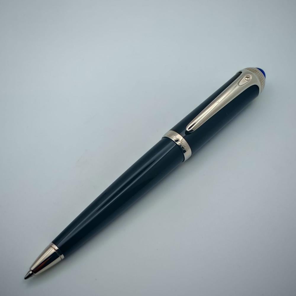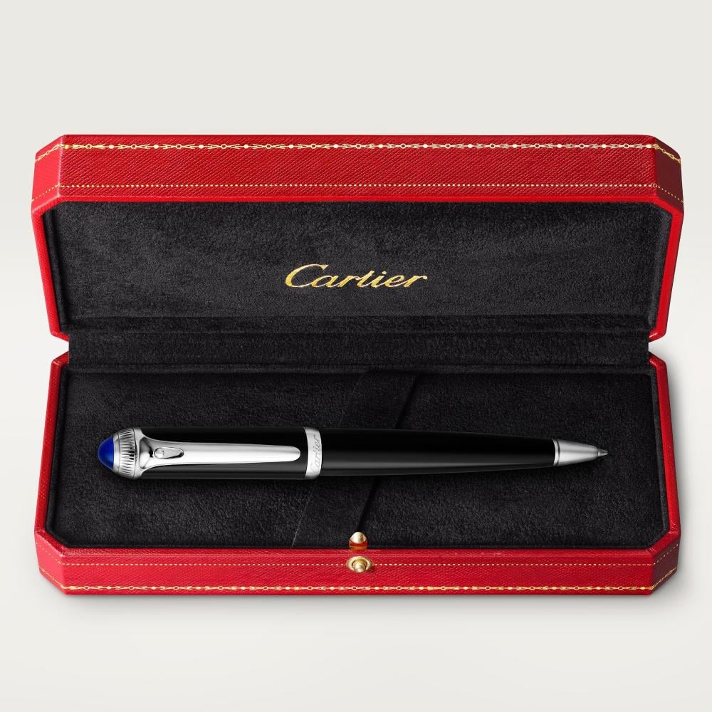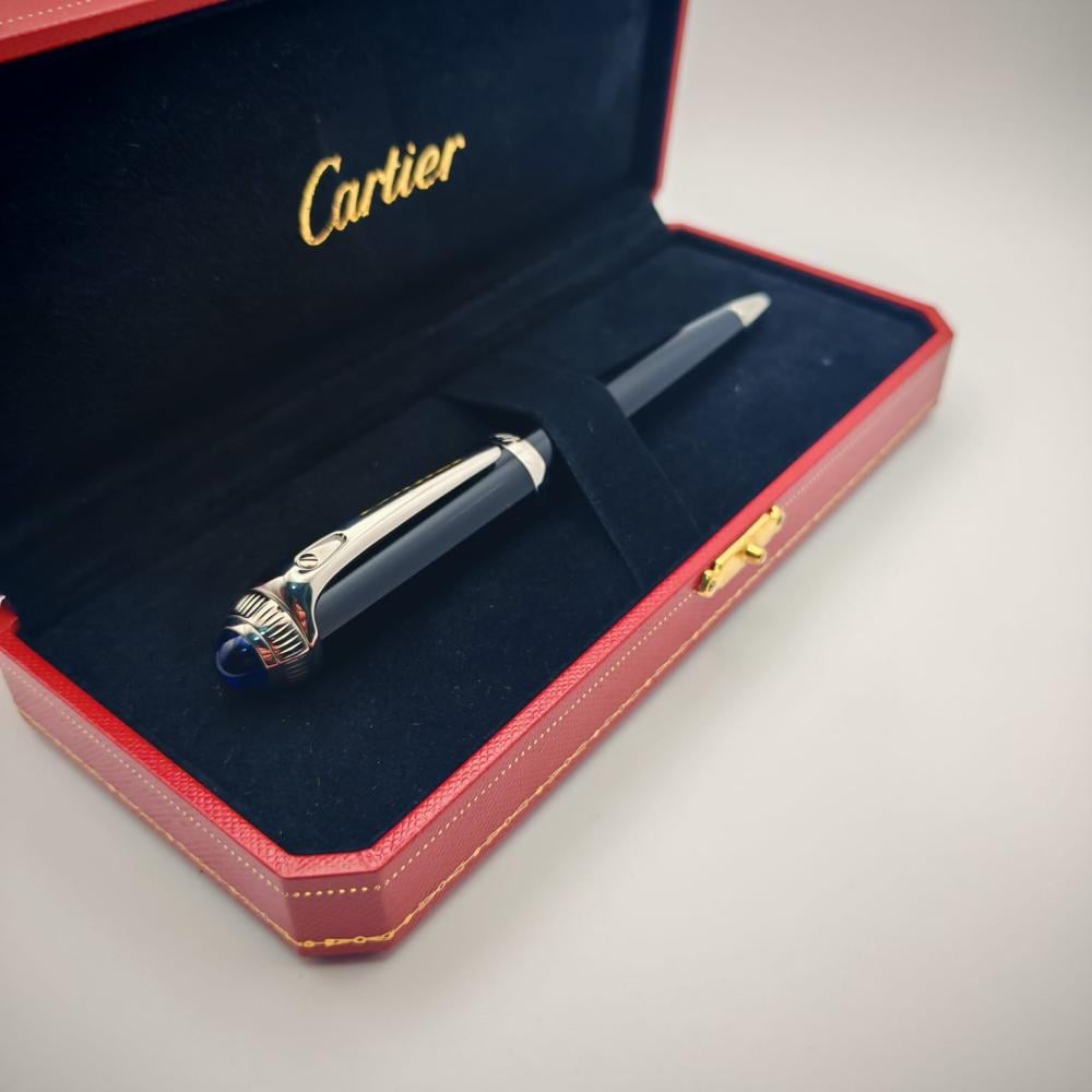 قلم فاخر من Cartier Roadster، يتميز بتصميم عصري أنيق باللون الأسود مع لمسات فاخرة، ويعلوه حجر أزرق مميز (Cabruchon Blue) على غطاء القلم.