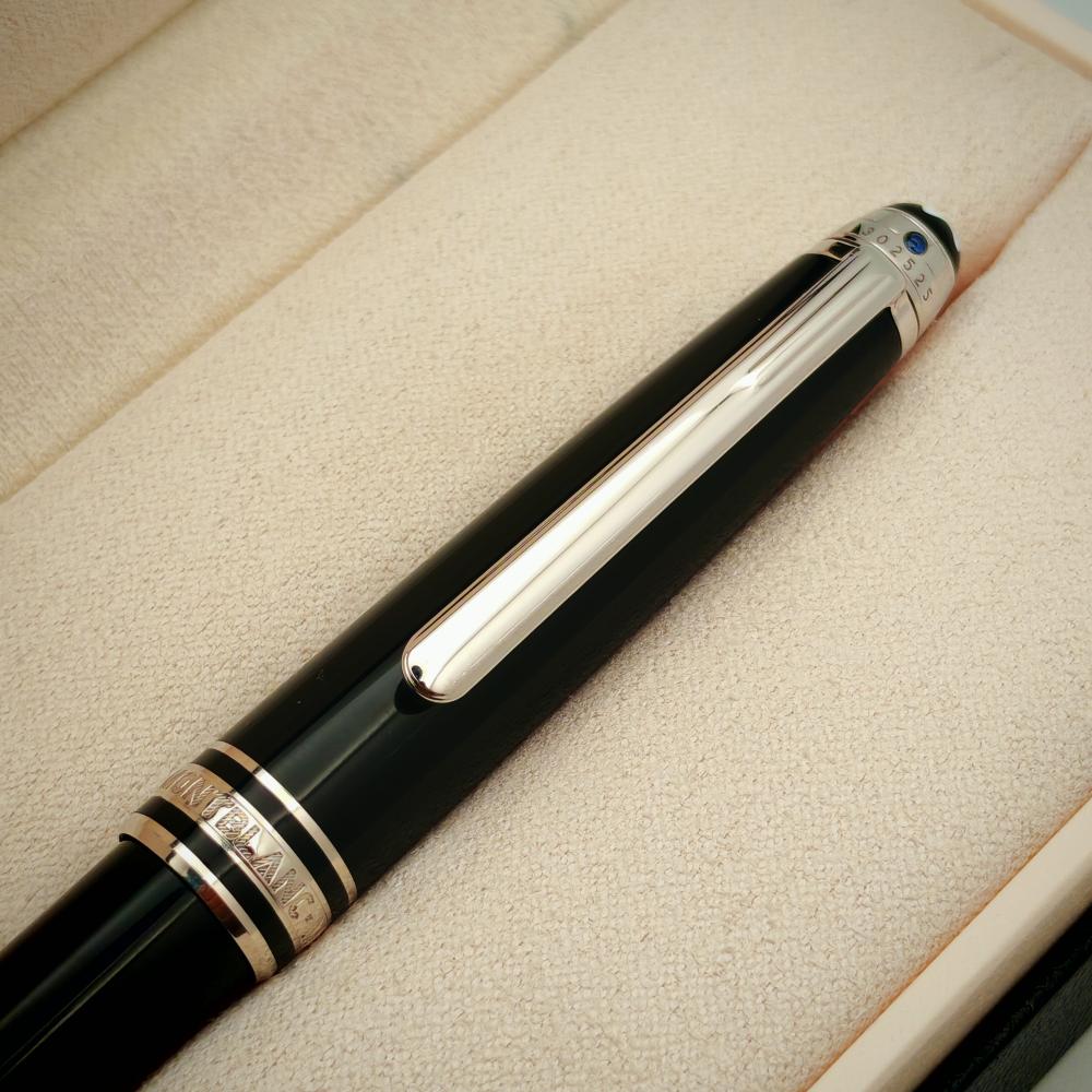 قلم مون بلان 144 إصدار اليونيسيف – أسود بحلقات بلاديوم وحجر أزرق أعلى المشبك