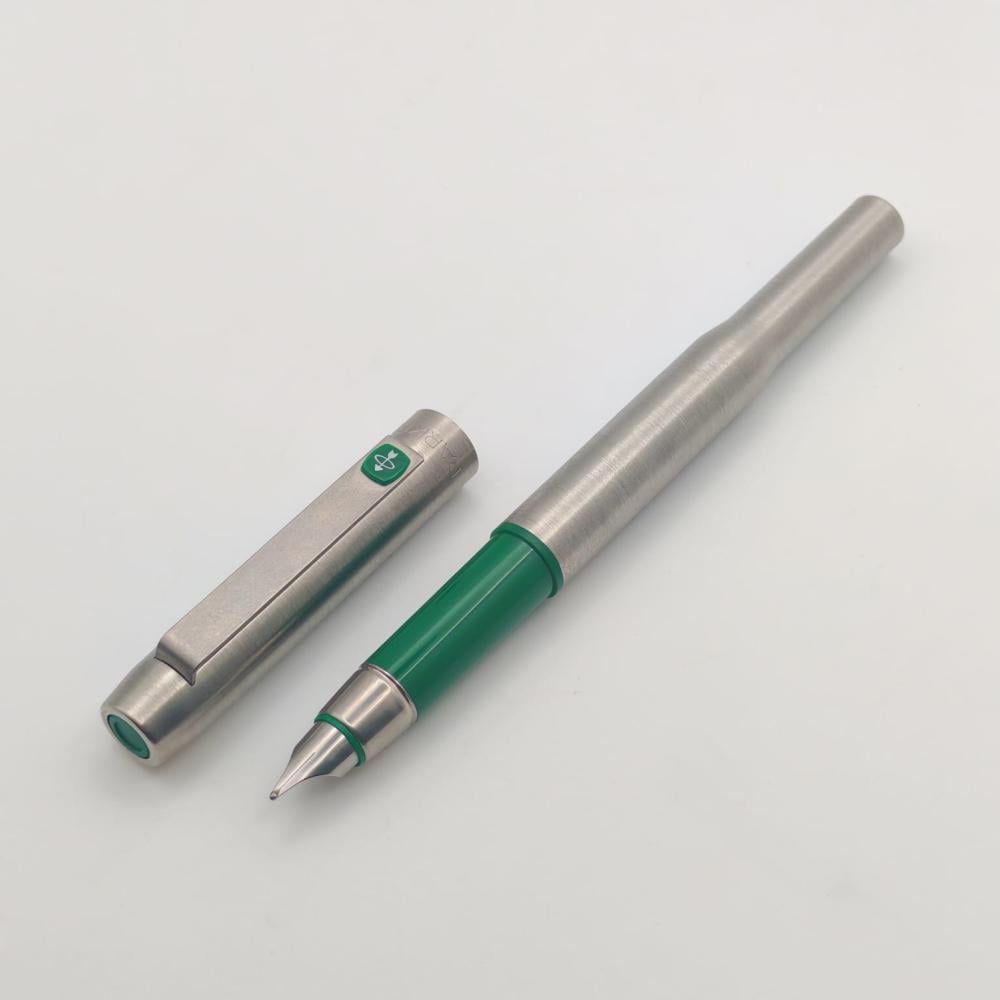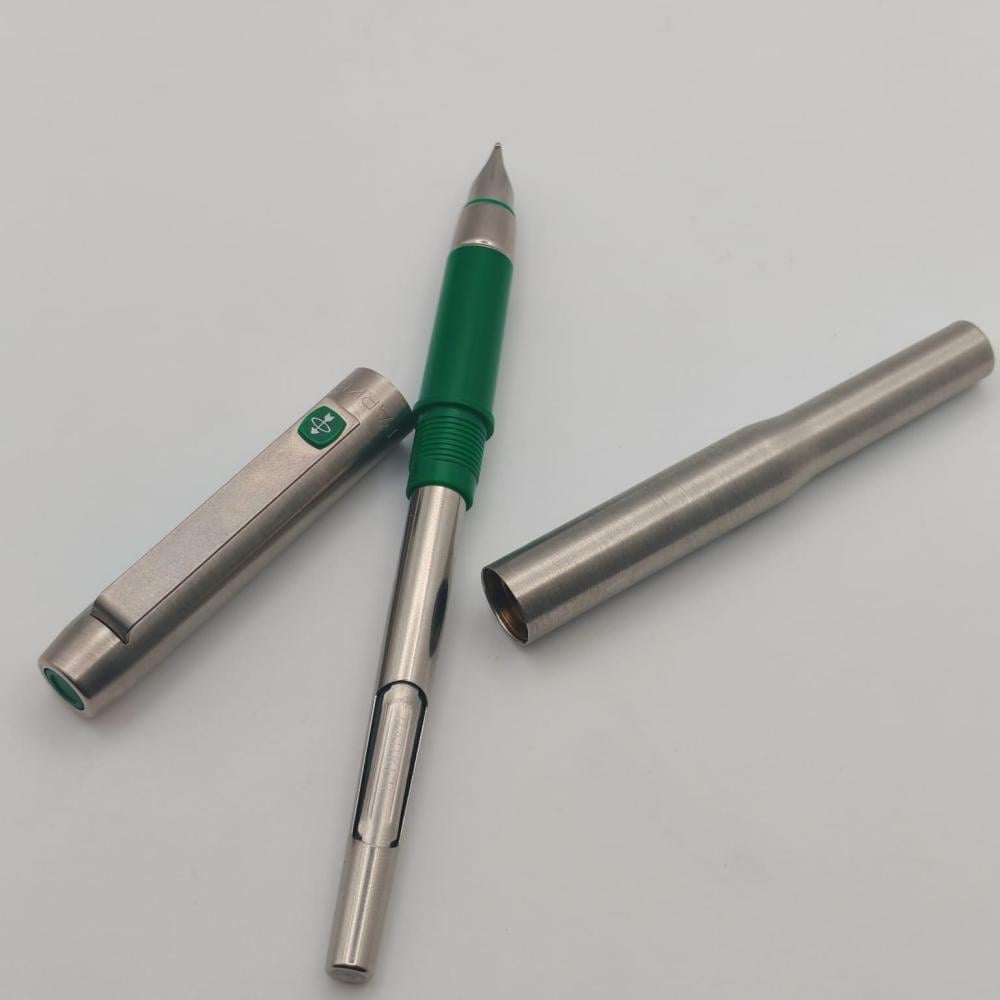 هيكل الأقلام : هيكل مصنوع من الفولاذ عالي الجودة باللون الفضي مع تفاصيل باللون الأخضر و مُزين بشعار شركة باركر .